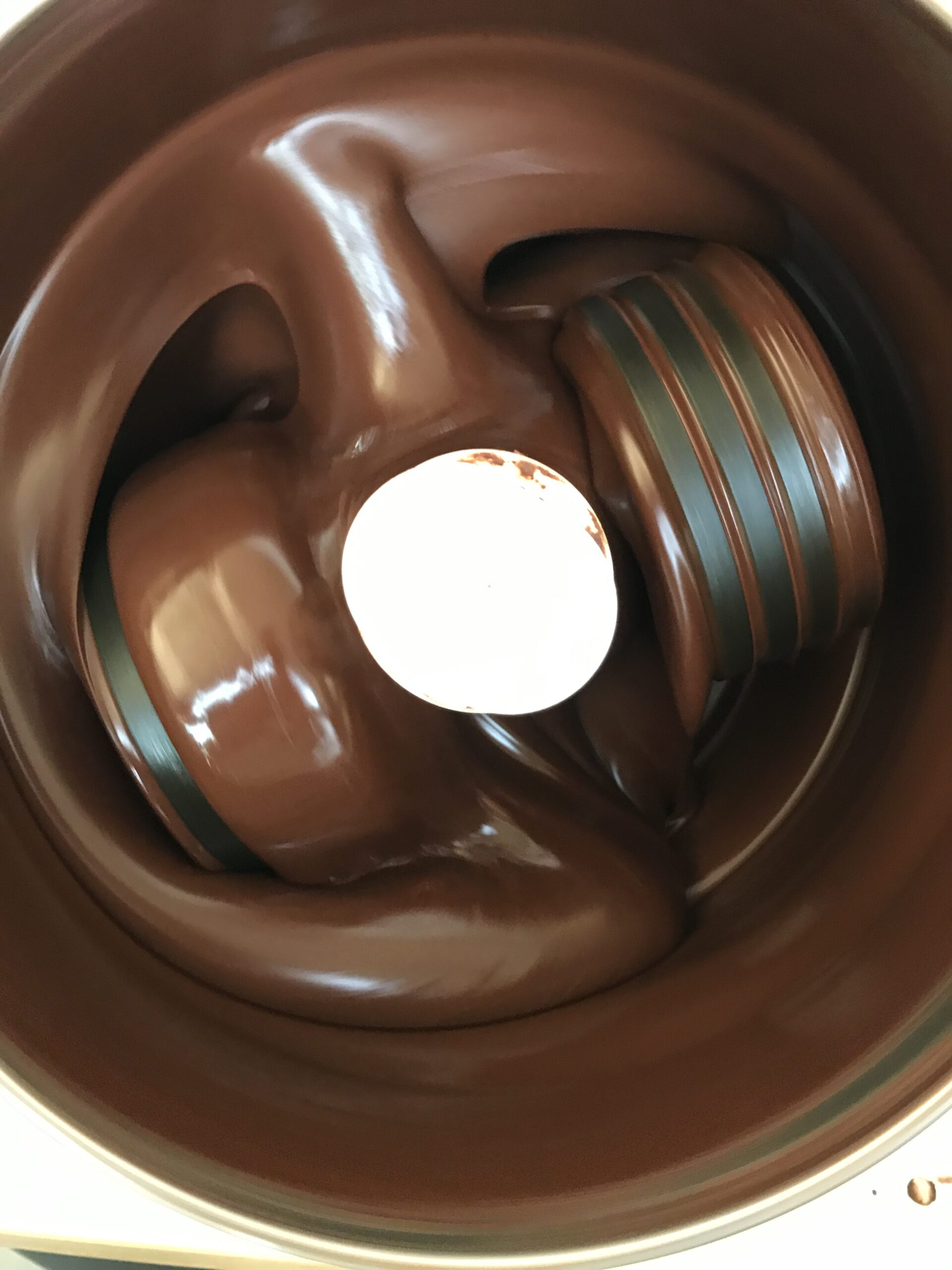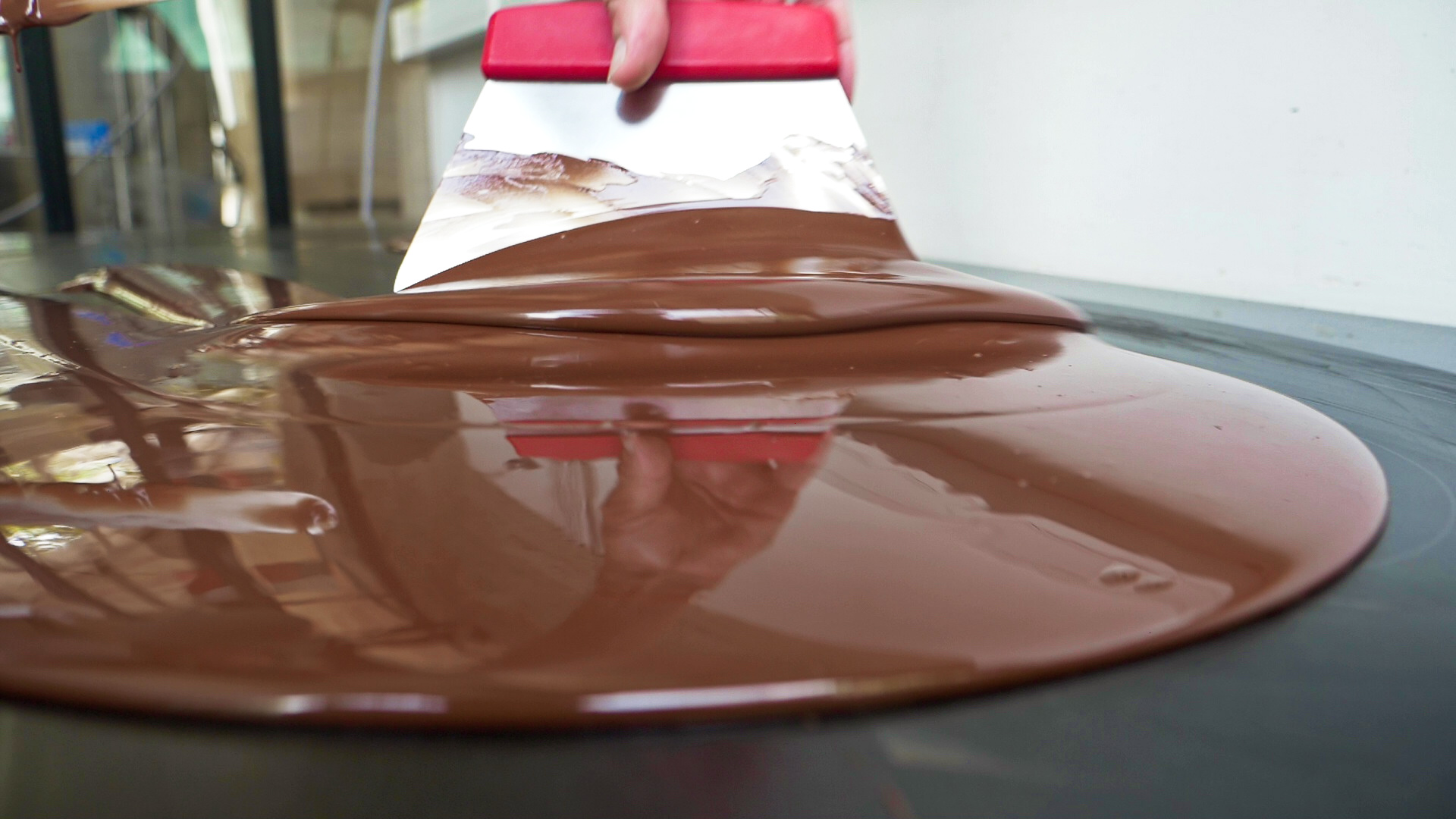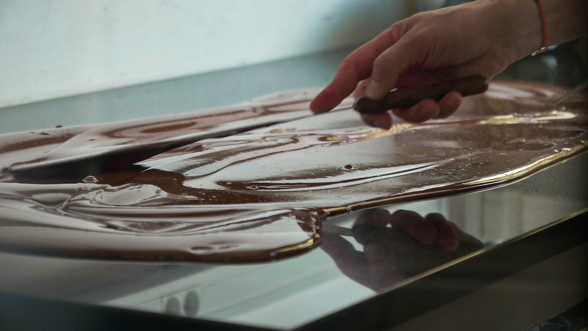 Vous assisterez à une démonstration du tablage traditionnel, du chocolat liquide sur le marbre pour le tempérer.